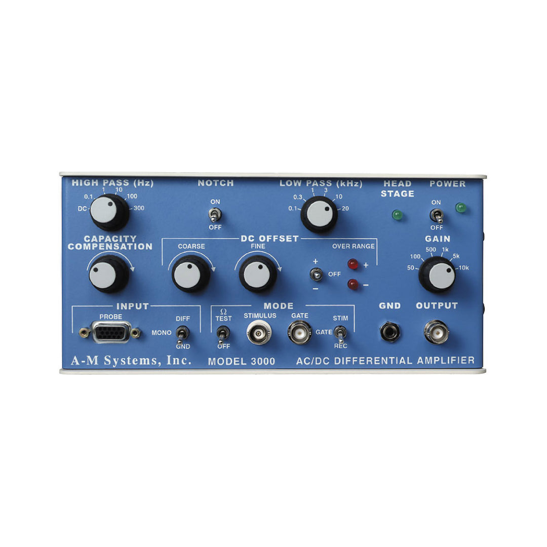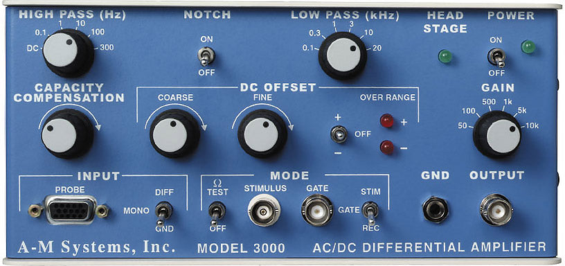 The Model 3000 AC/DC Differential Amplifier is designed for low-noise recordings from excitable tissue using low impedance (<1.5 MΩ) electrodes. When paired with an optional x10 gain headstage, the Model 3000 is perfect for single cell recordings using high-impedance glass or metal microelectrodes.